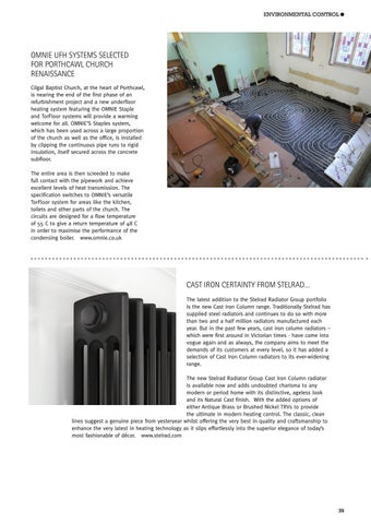 OMNIE UFH SYSTEMS SELECTED FOR PORTHCAWL CHURCH RENAISSANCE Cilgal Baptist Church, at the heart of Porthcawl, is nearing the end of the first phase of an refurbishment project and a new underfloor heating system featuring the OMNIE Staple and TorFloor systems will provide a warming welcome for all. OMNIE’S Staples system, which has been used across a large proportion of the church as well as the office, is installed by clipping the continuous pipe runs to rigid insulation, itself secured across the concrete subfloor. The entire area is then screeded to make full contact with the pipework and achieve excellent levels of heat transmission. The specification switches to OMNIE’s versatile TorFloor system for areas like the kitchen, toilets and other parts of the church. The circuits are designed for a flow temperature of 55 C to give a return temperature of 48 C in order to maximise the performance of the condensing boiler. www.omnie.co.uk