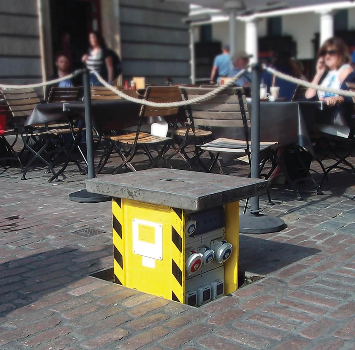 food stall operators and caterers with access to power sockets on-demand, minimising trip hazards as only short cables protrude and enable a continuous power supply to be delivered as the lid can be locked down for maximum safety.