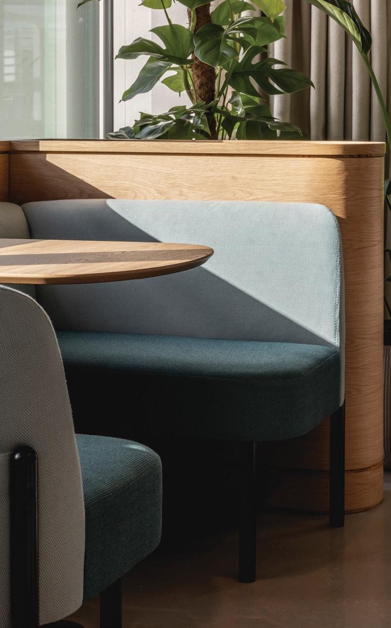 Acoustics have been carefully considered within the design. Bright yellow, geometric felt light fittings work with the planting scheme and acoustic wood slat wall to help ensure the sound is comfortable whether that's day time or evening.