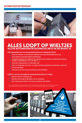 alles loopt op wieltjes als de AUTOMATISATIETECHNICUS (m/v) in de buurt is. HET takenpakket van een automatisatietechnicus is uitgebreid. Hij/zij leest de schema’s en bereidt de installatie van automatisatiesystemen voor. trekt kabels en bekabelt elektriciteitskasten. installeert hardware en software van elektrische toestellen en materialen (motoren, borden, schakelkasten, PLC’s en PAC’s*,…). sluit alle componenten en materialen aan. doet de afregeling van meet- en regeltechnische apparatuur (contacten, sensoren). test de installatie. informeert de klant over de werking van de installatie. LOOPT er iets mis, dan grijpt de automatisatietechnicus in. Hij/zij spoort fouten en storingen op. herstelt of vervangt onderdelen van de installatie. test of alles goed werkt en het proces opnieuw kan starten. * PLC’s (Programmable Logic Controllers) en PAC’s (Programmable Automation Controllers) zijn computers die industriële processen besturen. Meet sensor x iets bijvoorbeeld, dan wordt proces y stilgelegd.