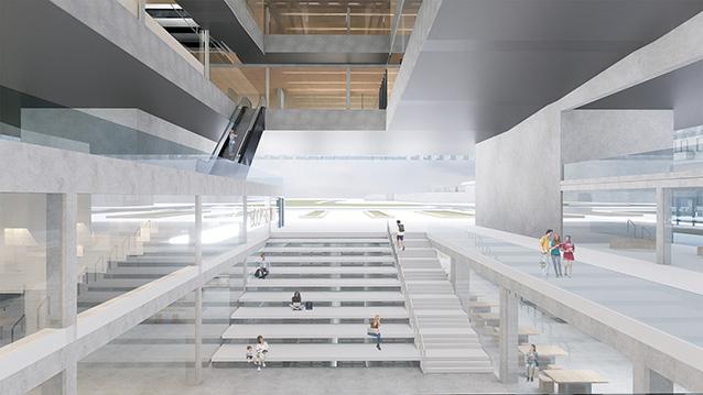 (East) to a more innovative and simulating split floor (West) through this central ramp, which also forms the void in the building. To blur the lines between the interior and exterior, where greenery plays a huge role, we have integrated a continuous landscape mound inside the Northern end of the project into the Ground floor space, encouraging new ideas and enhancing a positive experience.
