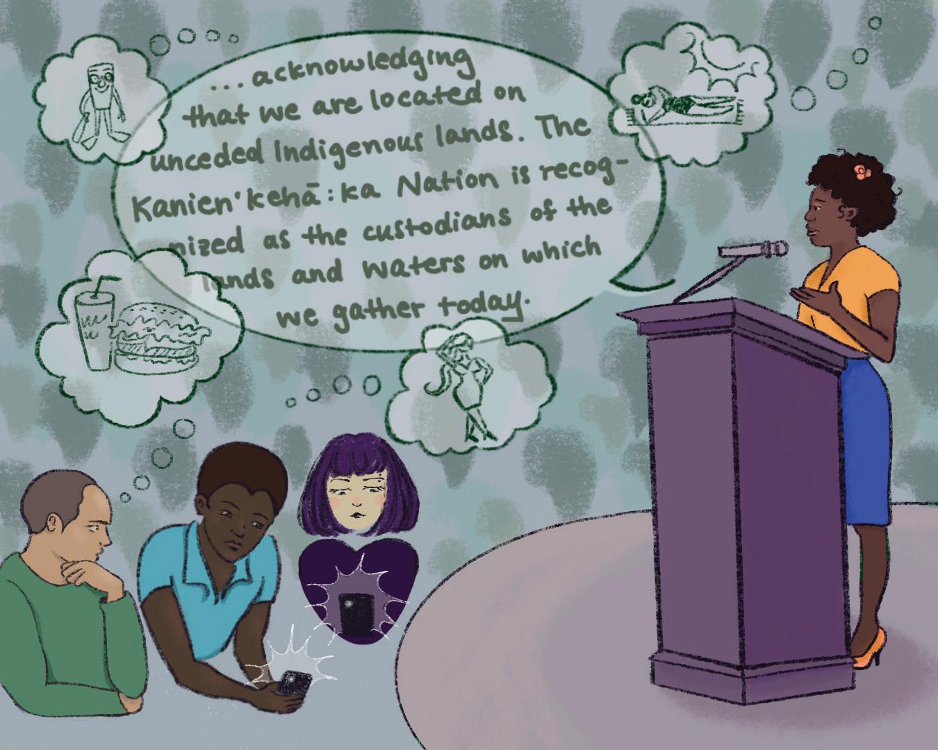 In theory, they’re meant to honour Indigenous nations. In reality, they’re o en over before they even start. e person reading it looks awkward and stumbles through pronunciations they never bothered to learn, and the audience—well, they’re already scrolling on their phones.