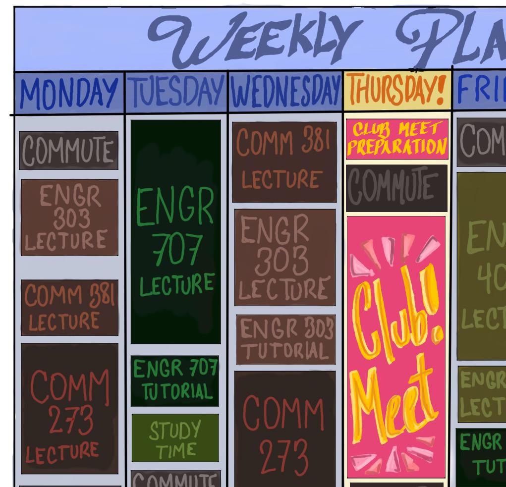 at all changed in September 2024, when I ran into a college friend on the shuttle who was involved in student media. A er catching up (and brie y spiralling over whether we were doing enough for our futures), she asked if I’d ever considered writing for a campus publication. at conversation became the start of my extracurricular life, and the rst time university felt like more than just classes. e truth is, it doesn’t matter what your “thing” ends up being or how long you commit. What matters is joining something that’s actually well-run. A good club or association can make your university experience. A disorganized one will drain you. Before you join, pay attention. Do the current members communicate clearly, support one another and seem like they know what they’re doing? Are people actually showing up and staying involved?