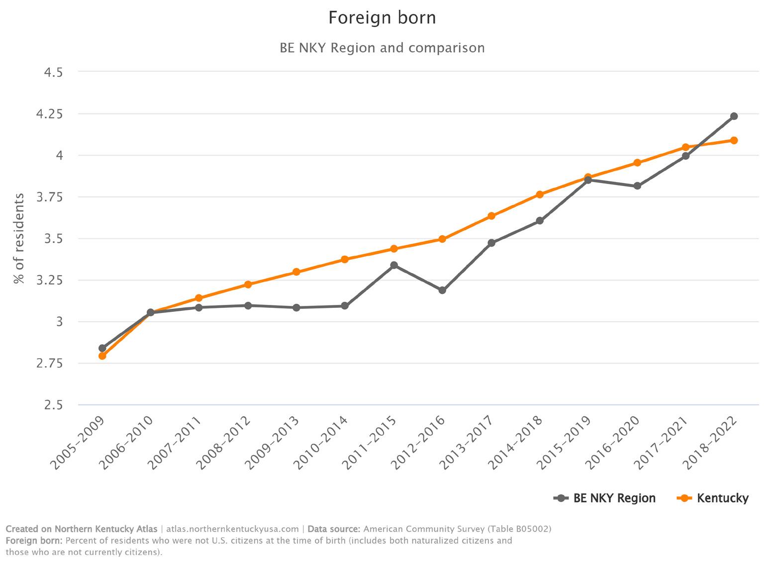 BE NKY Growth Partnership, using data from the U.S. census, estimates that just over 8,500 people born outside the U.S. came to live in Boone County between 2018 and 2023. In Kenton County, 6,161 people came to live from outside the country during that time; in Campbell County, it was 2,150.