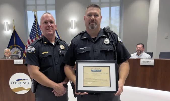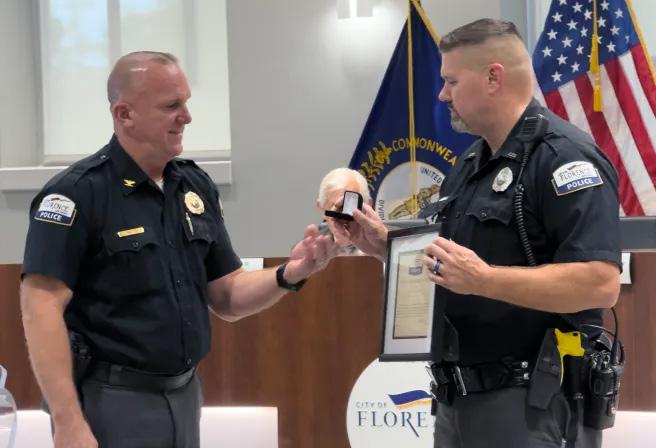 Florence Police Chief Jeff Mallery, left and officer Michael Stanaland at the Sept. 23 Florence City Council meeting. Stanaland received a distiguished service award. Photo by David S. Rotenstein | LINK nky contributor