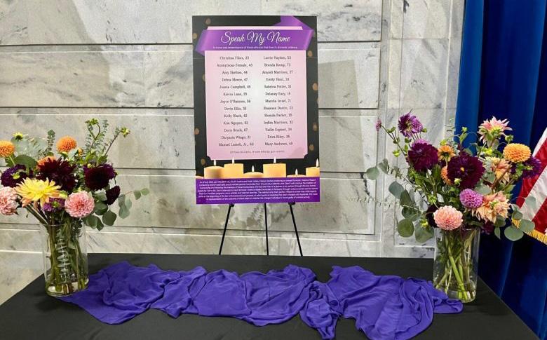 A list of Kentuckians who have died because of domestic violence, ranging in age from 19 to 73. Photo by Sarah Ladd | Kentucky Lantern