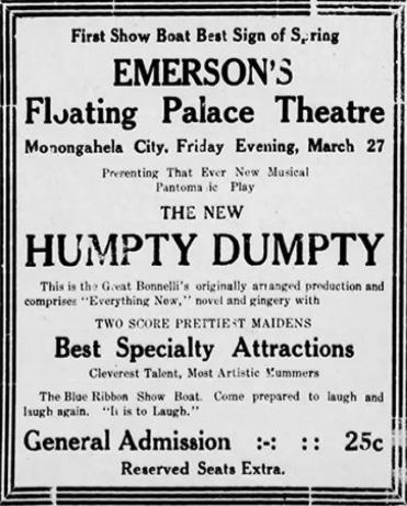 A March 26, 1908, ad for Emerson’s Floating Palace, one of nine showboats Ralh Gaches owned in his career. Monongahela, Pennsylvania, Daily Republican | Newspapers.com