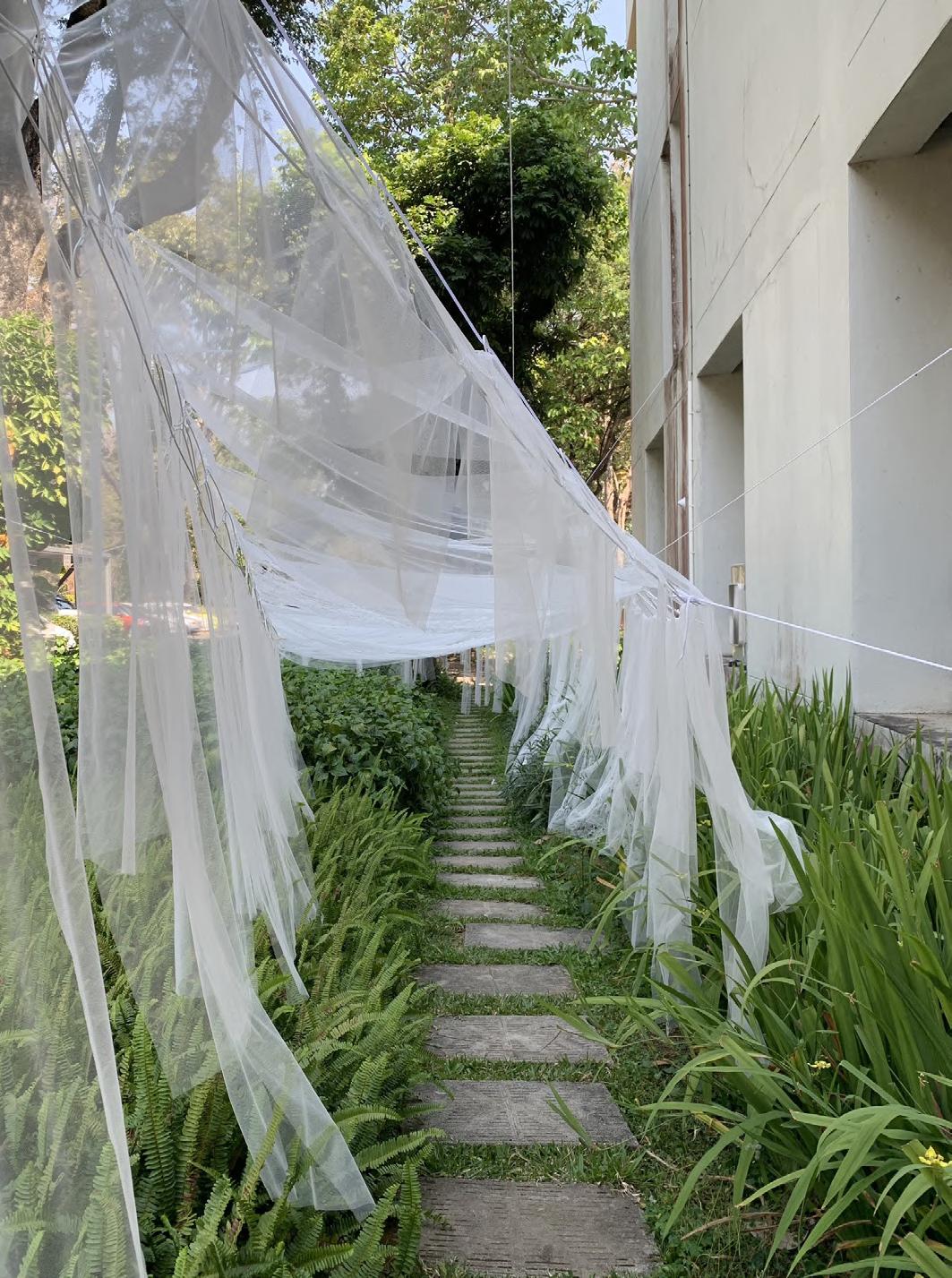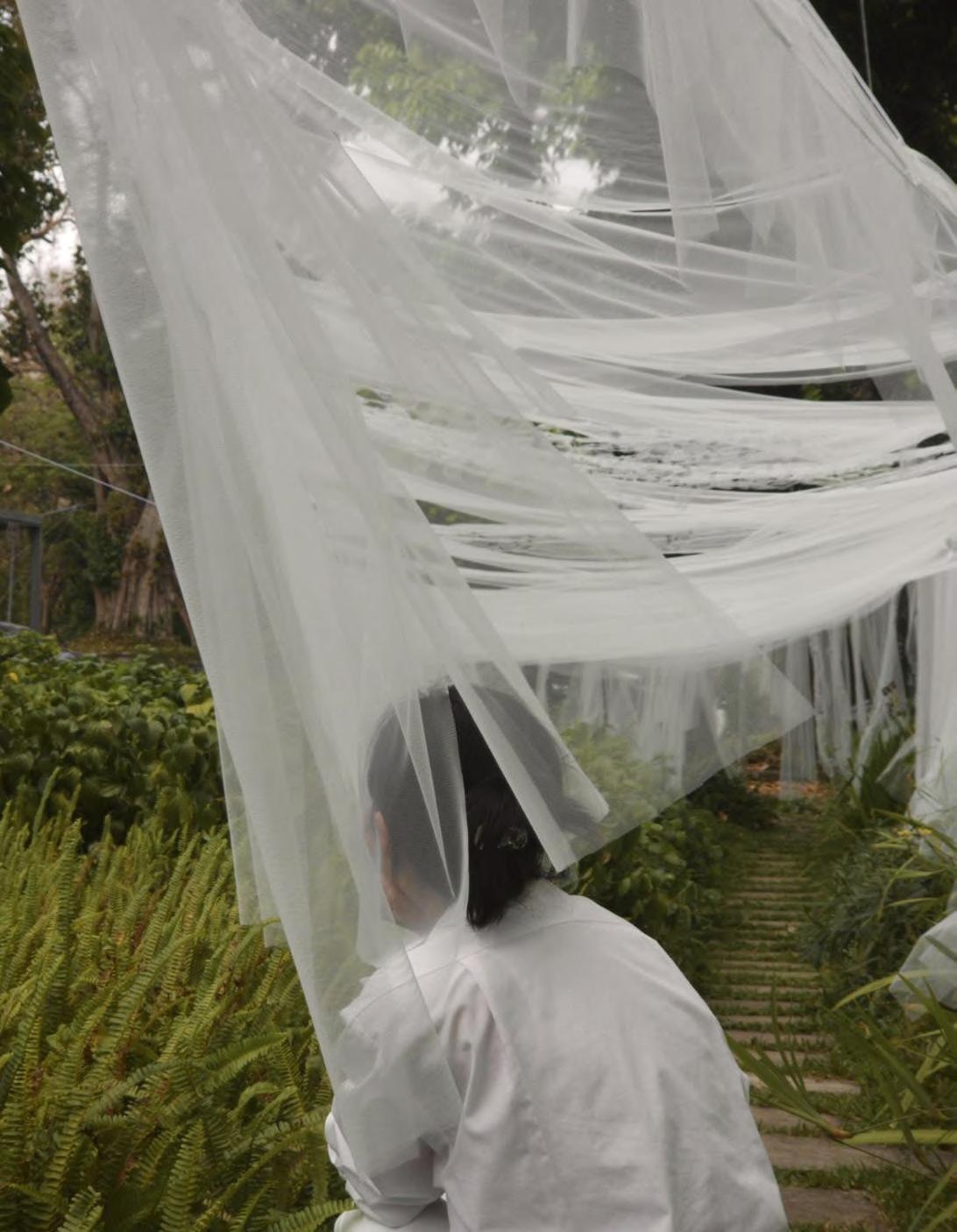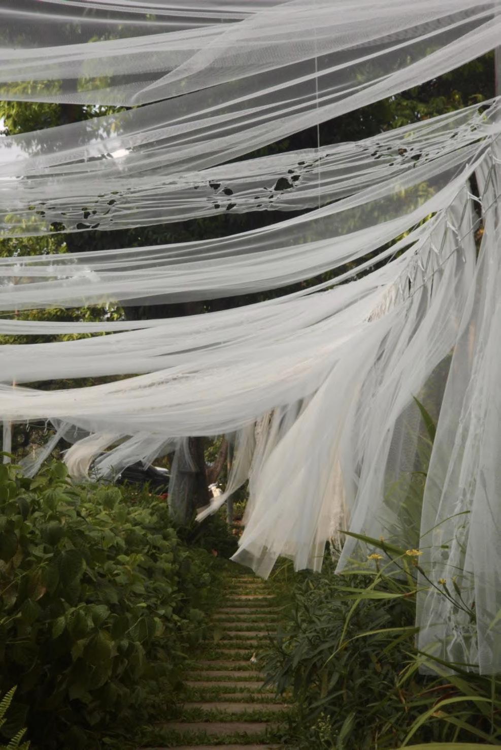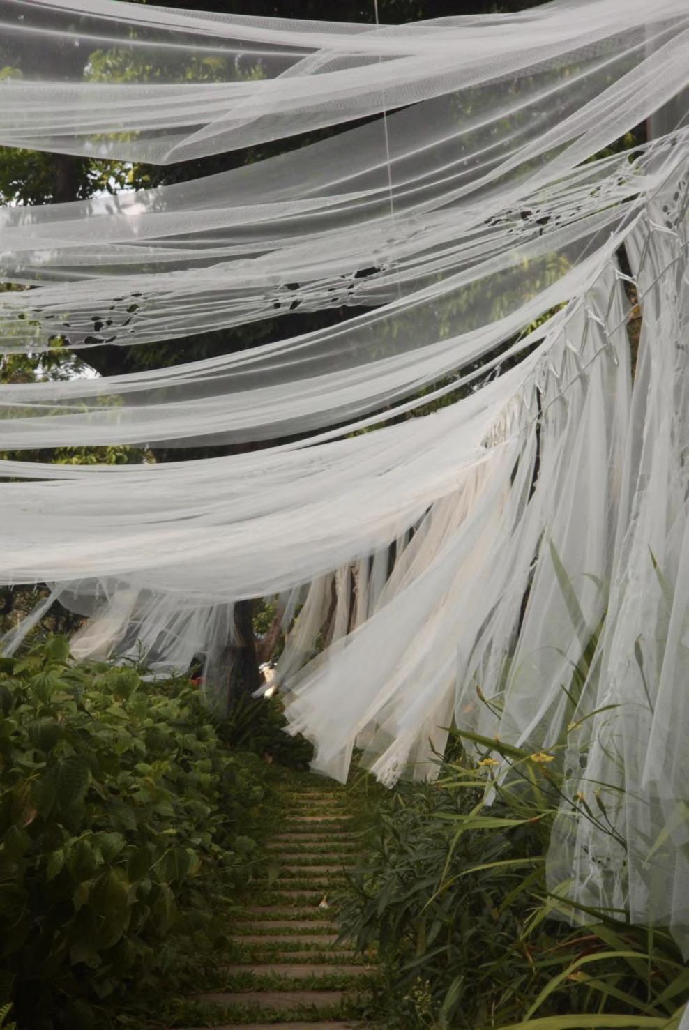 The choice of materials is inspired by the mosquito net, hanging and drying washed clothes where we can see the movement of fabric in the air.