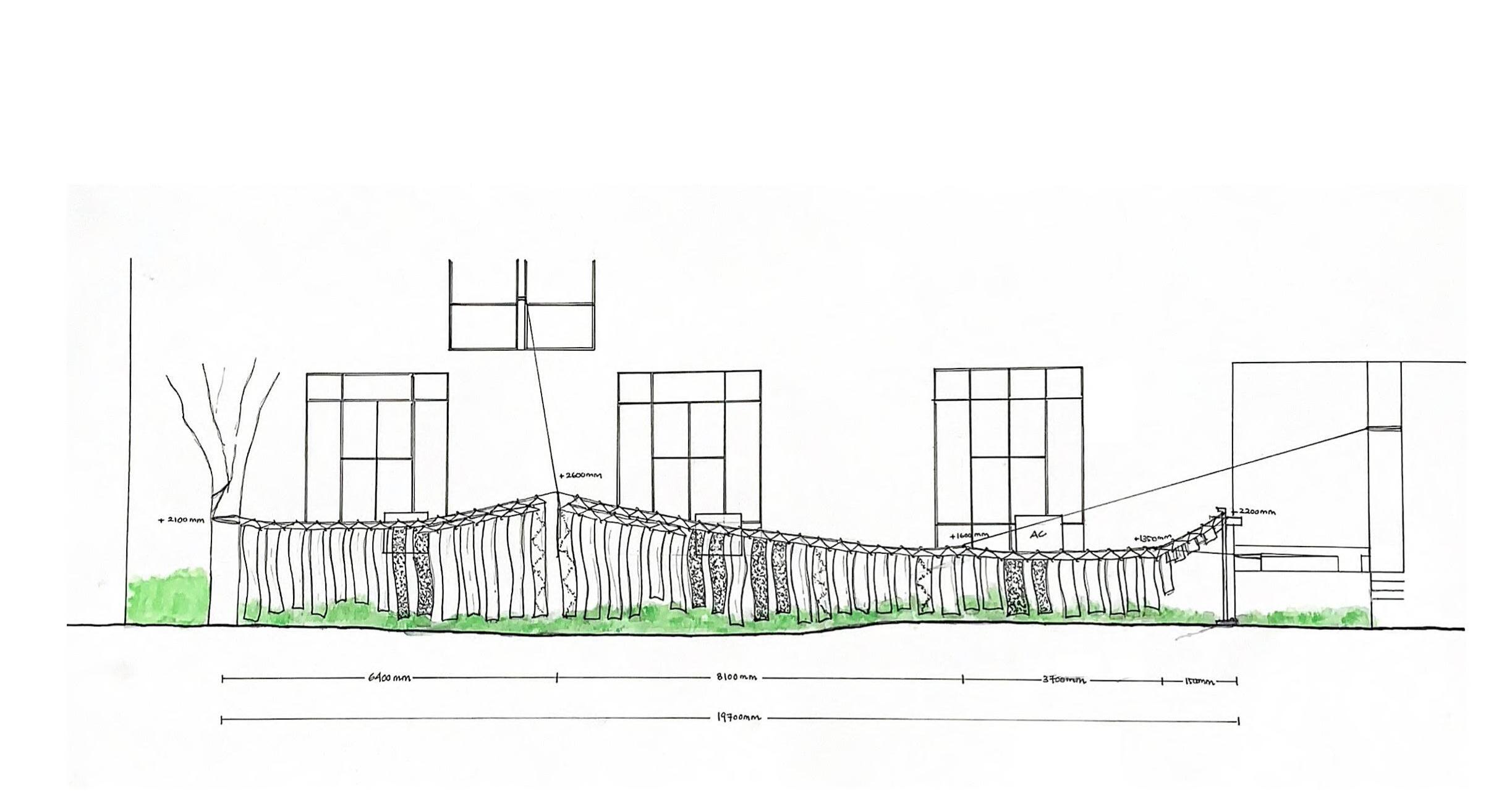 The mosquito net fabric will act as the main character catching the wind to create not only a graceful visual effect but also a playful tactile experience. The ropes and clothes hangers, our everyday objects, will serve as the supporting elements, adding familiarity and structure to the design.