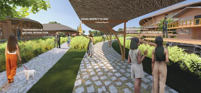 The multipurpose open space at the core, complemented by the surrounding community programs, fulfills essential public functions by inviting local community engagement and promoting local cultural practices. This strategic design fosters a direct dialogue with the visual elements that reflect the religious heritage of the Zedi, creating a harmonious integration between communal activities and spiritual symbolism.