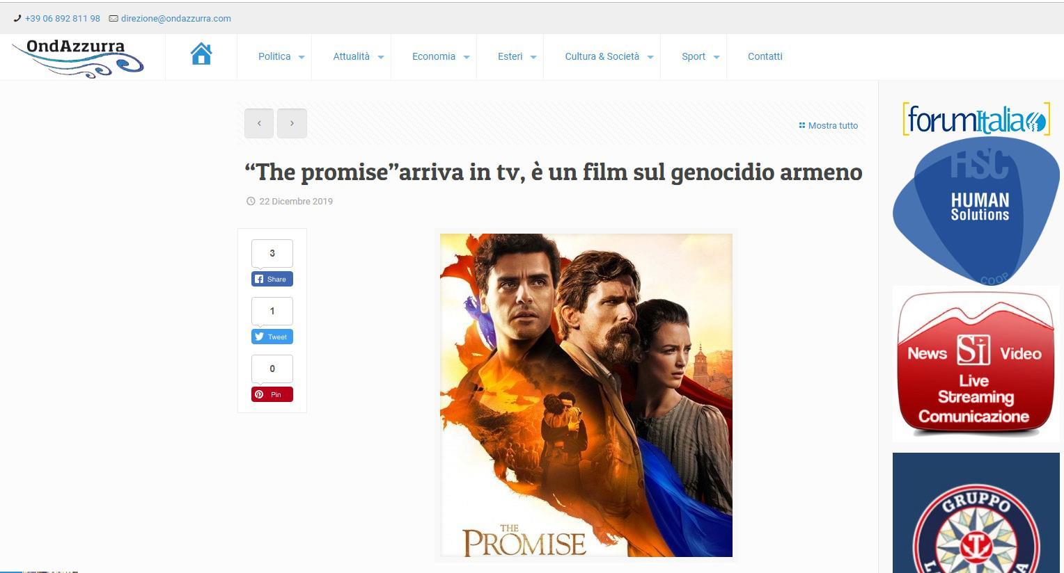 Finalmente è possibile vedere in TV “The promise”, il film diretto da Terry George, stupendamente interpretato da Christian Bale, Oscar Isaac e Charlotte Le Bon. Uscito nel 2016 e mai distribuito nelle sale, ha subito il sistematico boicottaggio riservato a tutti i film che parlano del genocidio armeno. Il primo dato da chiarire, pertanto, riguarda quanto traspare dalle scarne recensioni reperibili in rete, ivi compresa la nota di presentazione nel sito di SKY: la tematica principale del film “non” è il “triangolo amoroso”, che funge solo da supporto narrativo alla rappresentazione del primo grande genocidio del XX secolo: quello subito dal popolo armeno per opera dei turchi. Terry George ha ripetuto la metodica già sperimentata con “Hotel Rwanda”, dedicato al genocidio di oltreottocentomila Tutsi da parte dei miliziani Hutu, nel 1994. In quel caso lo spunto fu offerto da un personaggio reale, Paul Rusesabagina, direttore dell’'Hôtel des Mille Collines, che salvò 1268 persone da sicura morte. Nel film “The promise”, invece, il contesto storico è suggellato dal rapporto tra Chris, giornalista statunitense dell'American Associated Press (Christian Bale), la fidanzata Ana, artista di origine armena (Charlotte Le Bon) e l’armeno Mikael, brillante studente di medicina (Oscar Isaac), che allaccia una relazione con Ana, favorita dalle contingenze del momento e dalle comuni radici, pur essendo sentimentalmente impegnato con una ragazza del suo paese natio, promessa sposa: da qui il titolo del film. La rivalità amorosa tra i due uomini, però, viene completamente surclassata (il termine appropriato è “annullata”, come si comprenderà guardando il film) dagli eventi che fecero seguito allo scoppio della Prima Guerra Mondiale e indussero “i giovani turchi”, al potere dal 1909, a sterminare le minoranze etniche, la più numerosa delle quali era