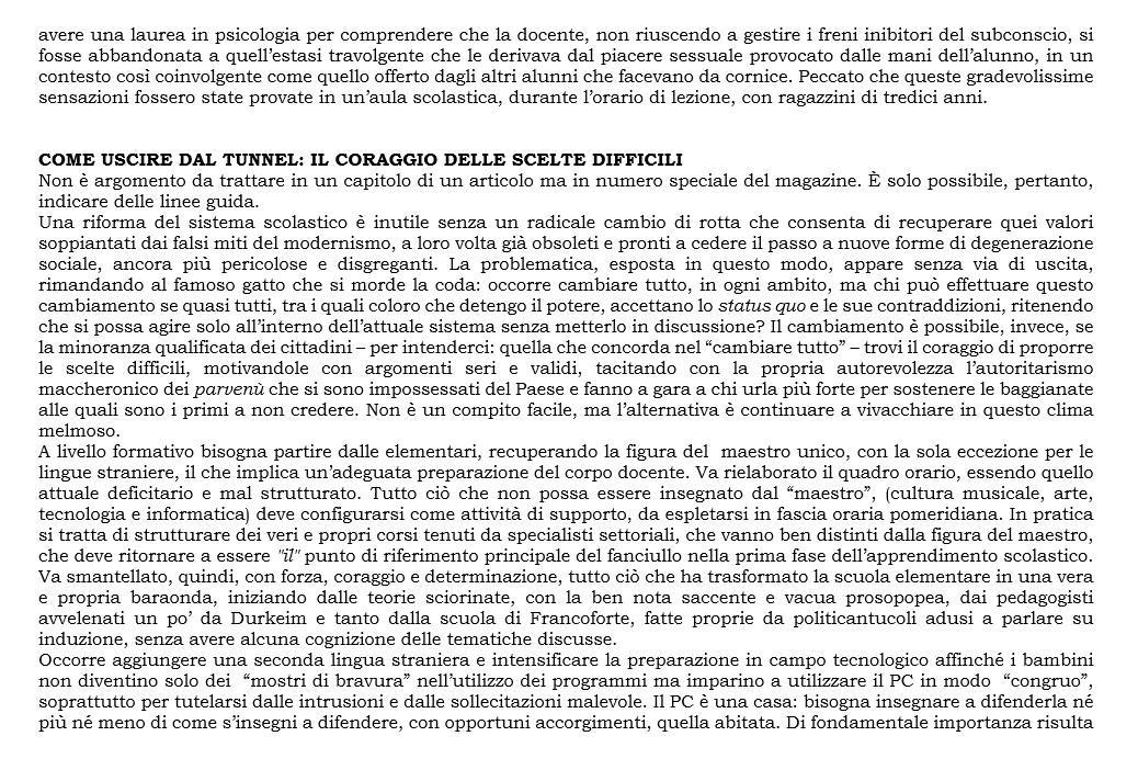Che cosa fare, quindi? In questo Paese vi sono ancora tanti "marinai" che, con le carte in regola e senza rischio di essere sbugiardati da "Report", sono in grado di riportare la nave sulla corretta rotta. Solo che tanti di loro sono stanchi e non hanno più voglia di domare mari tempestosi. Beh, l’invito è quello di deporre le pantofole e risalire a bordo. Questa società ha bisogno di loro più di quanto il viandante del deserto abbia bisogno di acqua. Non possono lasciare le giovani generazioni né in balia dei cretini di sinistra né balia di altri cretini, non meno pericolosi, perché, come più volte scritto, una giusta causa, difesa da persone sbagliate, diventa una causa sbagliata.