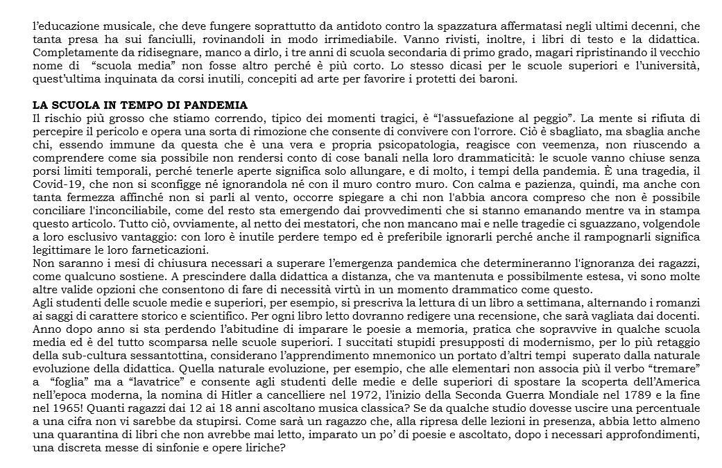 non li crea? Togliere milioni di ragazzi dalle strade e dai trasporti fatiscenti, rebus sic standibus, contribuirebbe sensibilmente al contenimento della pandemia. Assodato che i no vax rappresentino un pericolo pubblico e che l’adozione del Super Green Pass, lungi dall’indurli alla ragione, abbia solo fatto lievitare il livore, come ogni psicologo sarebbe in grado di spiegare (l’aumento della rabbia nei soggetti psico-labili è direttamente proporzionale all’inasprimento dei provvedimenti che l’abbiano fomentata), perché non prendere in considerazione l’idea di rendere il vaccino obbligatorio per tutti? Si rischiano rivolte di piazza? No. Non si rischiano: basta mettere subito fuori gioco coloro che le organizzano: i capipopolo e i capi-rivolta. Senza un capo che li porti al macello, le masse se ne stanno buone nei loro ovili. Siamo tutti testimoni diretti, o indiretti grazie ai servizi televisivi, della leggerezza comportamentale di tante persone, in particolare dei giovani drogati di movida, ai quali si aggiungono quelli proprio fuori di testa che si fanno contagiare per ottenere il Green Pass. È chiaro che le forze dell’ordine da sole non ce la fanno a controllare il territorio, né in chiave preventiva né in chiave repressiva. È così difficile chiedere aiuto all’esercito? Vogliamo capirlo, una volta per tutte, che “democrazia” non fa rima con “anarchia” e che la tolleranza, come c’insegna Popper, al pari della libertà, non può essere illimitata, altrimenti si autodistrugge?