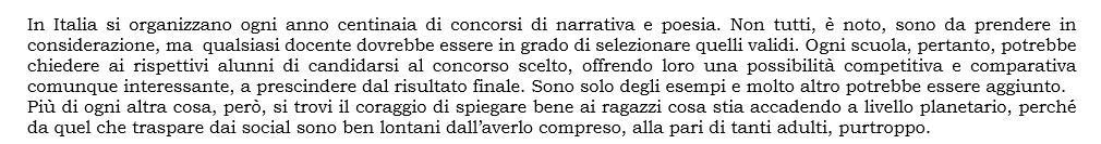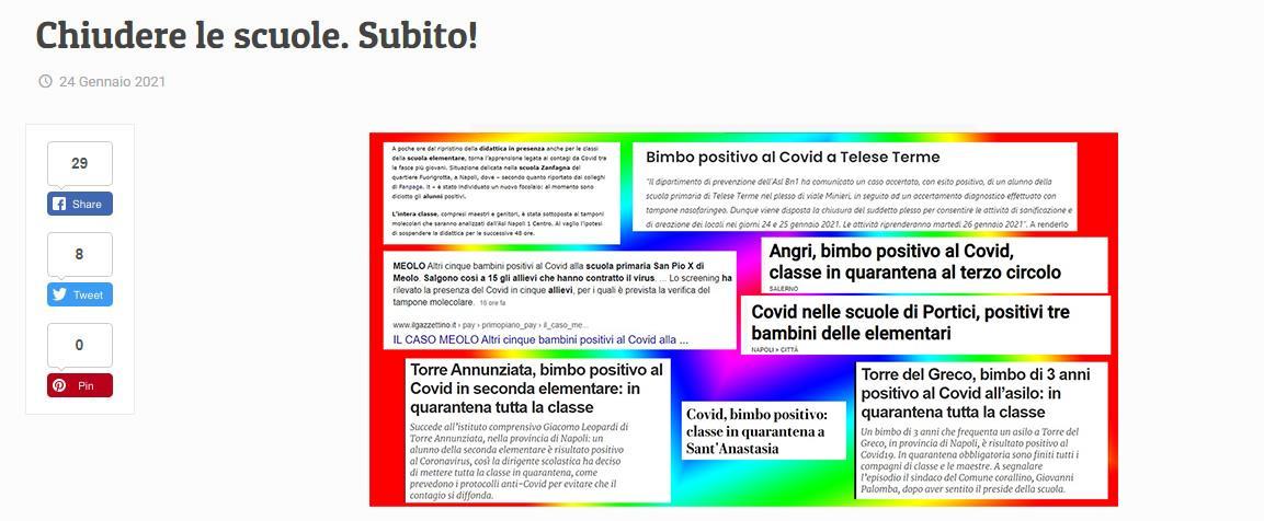 Quotidiano napoletano "Il Mattino", edizione web, 7 dicembre 2020. Un cronista intervista persone nel corso di una manifestazione contro la chiusura delle scuole. “Sono una madre, oltre che una cittadina, arrabbiata, anche perché mio figlio, in prima elementare, è riuscito a rientrare a scuola, ma mi sento appesa a un filo di decisioni arbitrarie e immotivate. Questo conflitto interistituzionale che si è creato sulla scuola, domani si potrà creare su altri aspetti della vita civile. È molto pericoloso. Dobbiamo muoverci per la scuola, per l’istruzione, ma, in generale, per la democrazia. Mio figlio ha fatto rientro, fortunatamente. È tra i pochi fortunati. Ovviamente è diventato un altro bambino e lo dico senza retorica: è evidente che la vita gli è completamente cambiata. Però è ritornato in una scuola vuota, in cui ci sono solo le due prime. Sono ritornati quasi tutti i suoi compagni di classe e quindi non è vero che i genitori poi non mandano i figli a scuola (ridacchia, N.d.R.). Però devono tornare anche gli altri! (Tono austero, imperativo, non esortativo, N.d.R.). Sono i cittadini di domani. Io non voglio vivere in una società, domani, in cui ci sono ragazzi alienati che hanno vissuto i migliori anni della loro vita nell’alienazione. Non siamo negazionisti. Il covid durerà a lungo o comunque le conseguenze del covid dureranno. Allora non si può tutelare soltanto il diritto alla paura”.