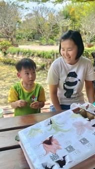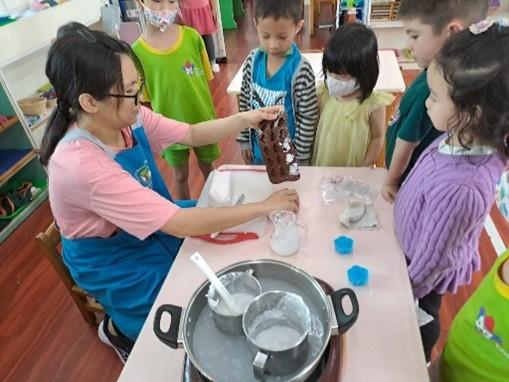與孩⼦⼀起製作⼿工皂,使⽤皂基隔⽔加熱,加⼊喜歡的 精油後,倒⼊模具就完成了,讓孩⼦們帶⼿工皂回家洗 ⼿,愛上洗完⼿的味道!