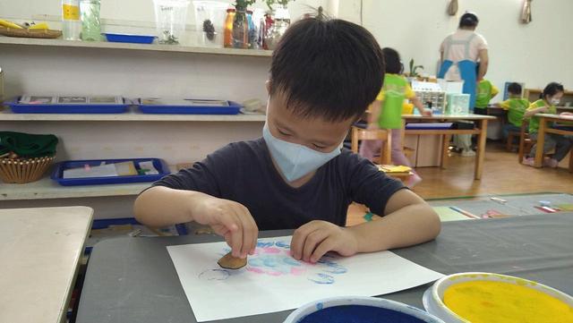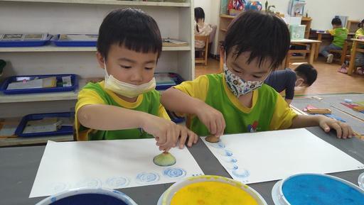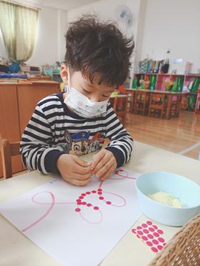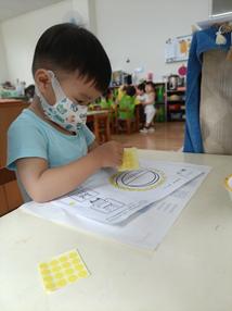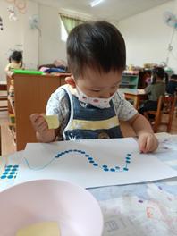 玩具、教具百百種,有時候讓孩 子回到最單純的手作,只需要 張紙、畫筆和圓點點就可以玩出 美麗的作品。既有完成成品的效 果,又有自我主導權的感受在裡 面,可以獲得成就感。