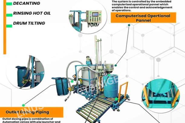 Drum Decanting Unit can be used for emptying a defined value of additives without any cross contamination into the production process of lubricants. The product has various operational features such as decanting operation, Rinsing operation, drum tilting, heating, etc. The high-performance DDU brings the expensive additive into the production process without neither product loss, waste oil onset, and high-precision dosing by weighing technology. The unit is easy to handle, satisfies the highest safety standards, and runs in clean and completely closed conditions.