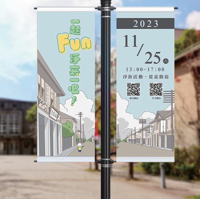 設計淨街集點活動,促使嘉義文化發展,設定 嘉義部分特色景點區 域舉辦淨街活動,使年輕族群(17~25歲)淨街過程中認識嘉義不同 歷史文化,同時增加對周圍環境的圍護意識,其中結合集點拿小禮 形式,在各景點設置集章處,完成整趟活動後即可兌換特色週邊, 並以此活動名義捐款至GREENPEACE綠色和平此機構,讓愛心從嘉做 起。