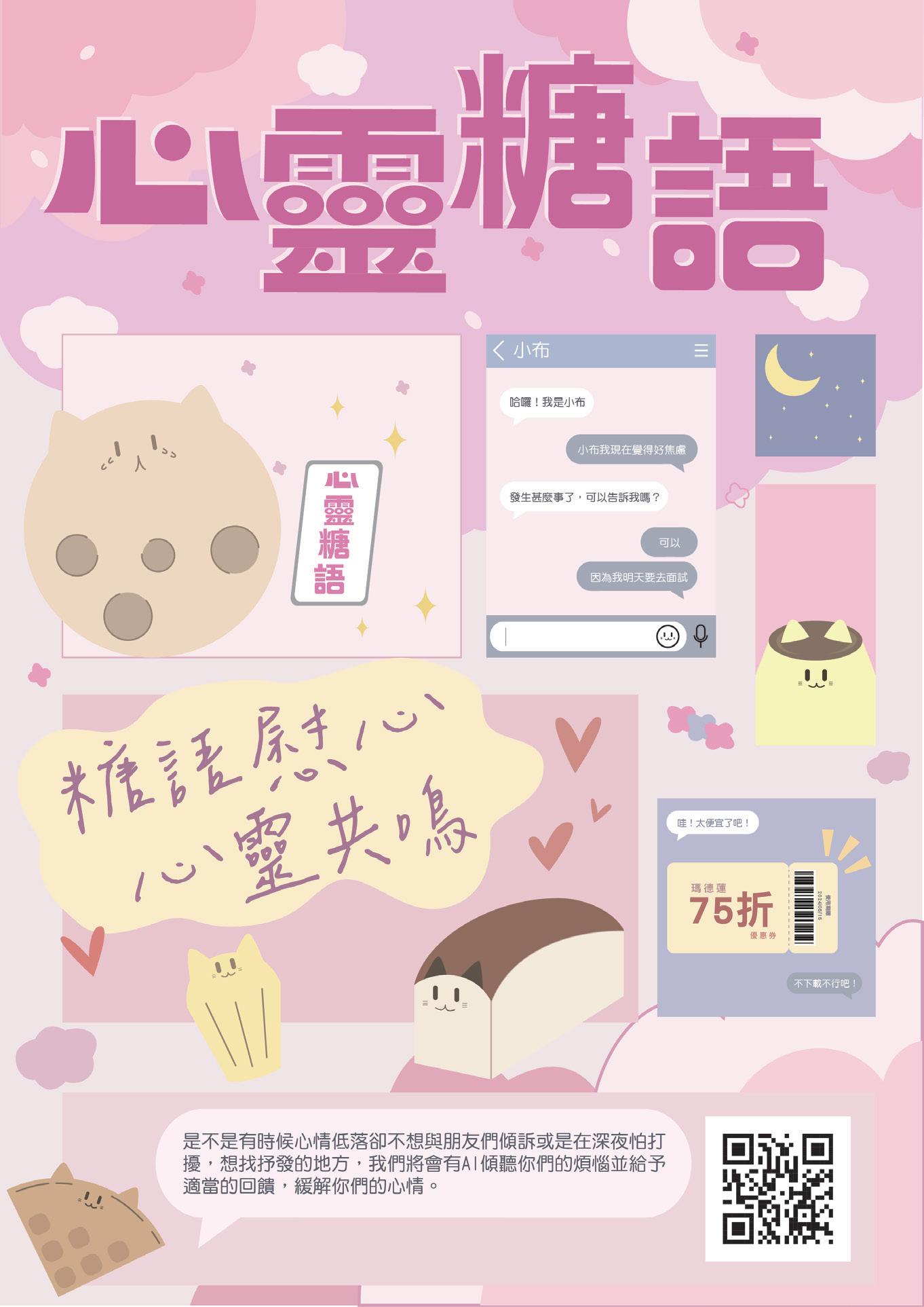 幫助心情低落但不想和朋友傾訴或是在深夜怕打擾朋友的人找到一個可以抒發的 地方,將會有AI傾聽他們的煩惱給予適當的回饋,在聊天結束後會依照每個人的 情況給予他們不同甜點的優惠券讓他們能去現場購買。