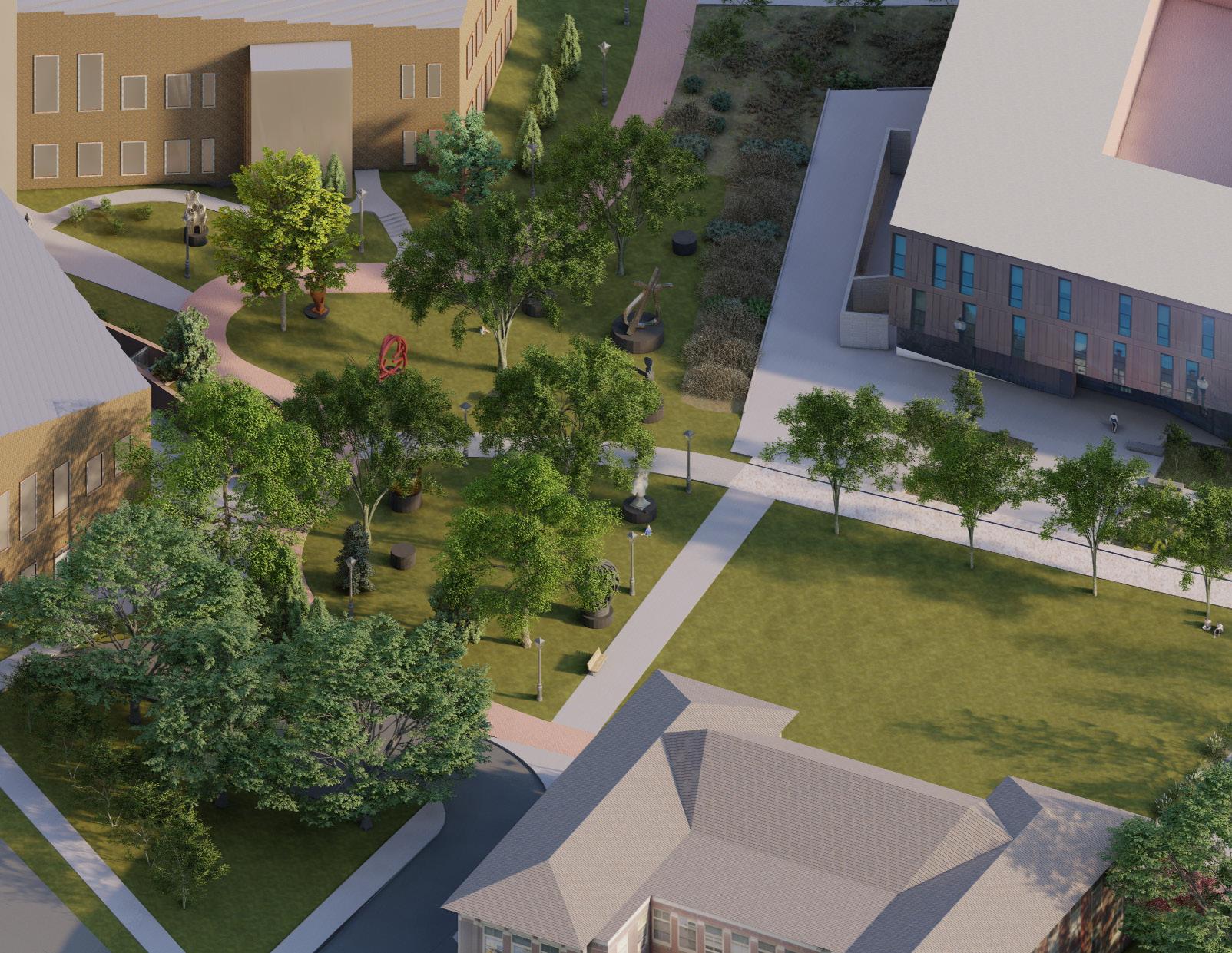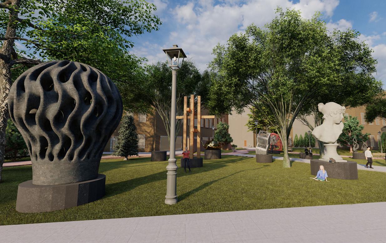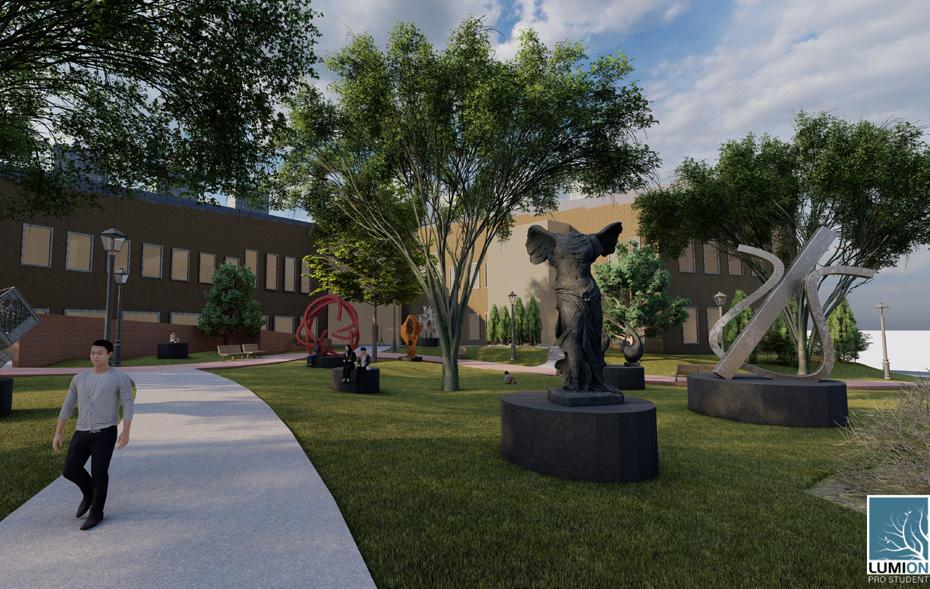 Sculpture garden with pedestals that allow for a rotating display of student work.