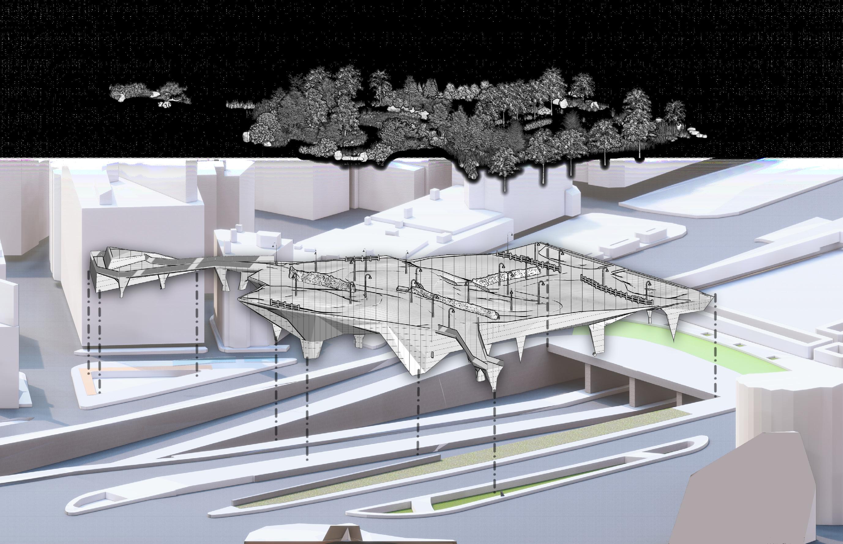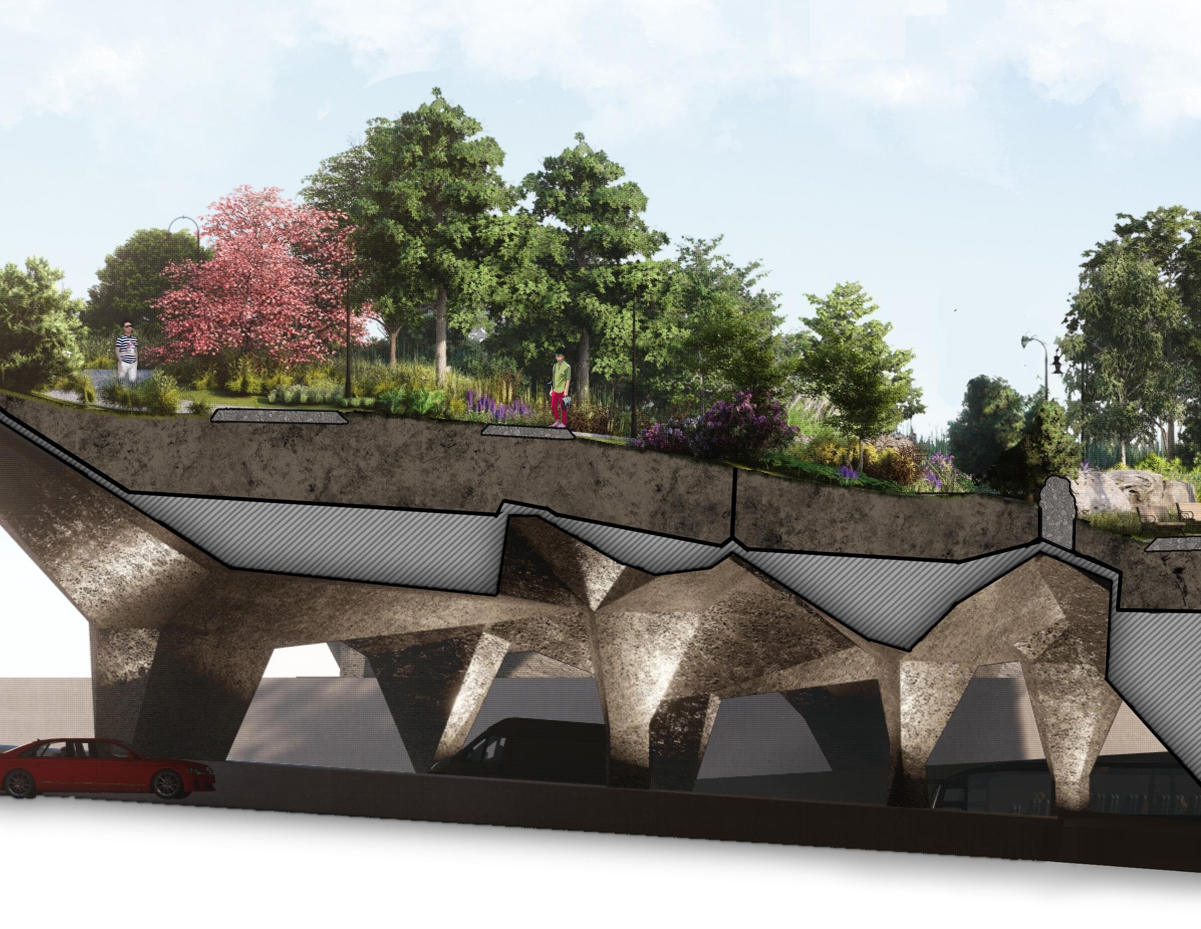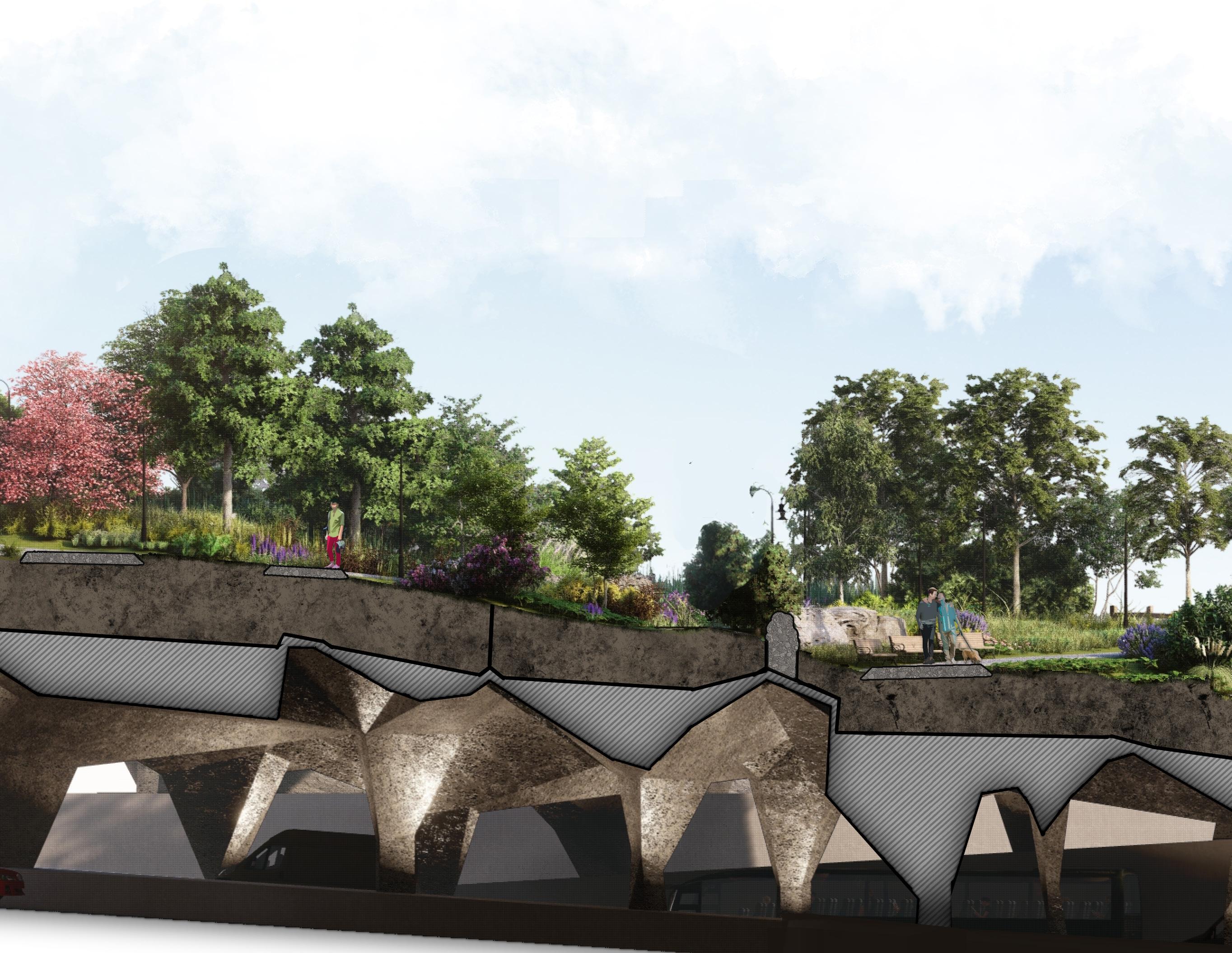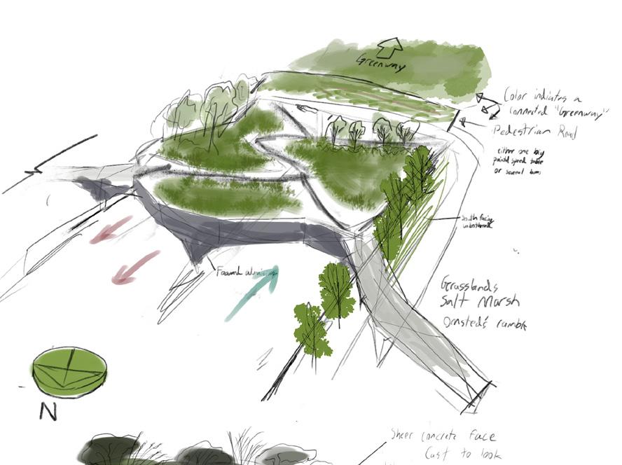 The design also pays tribute to the ecosystems that surrounded the peninsula, filled in by land reclamation efforts. While entire neighborhoods of land were created over top of salt marshes and tidal flats, here plant life is added over top of an urban freeway.
