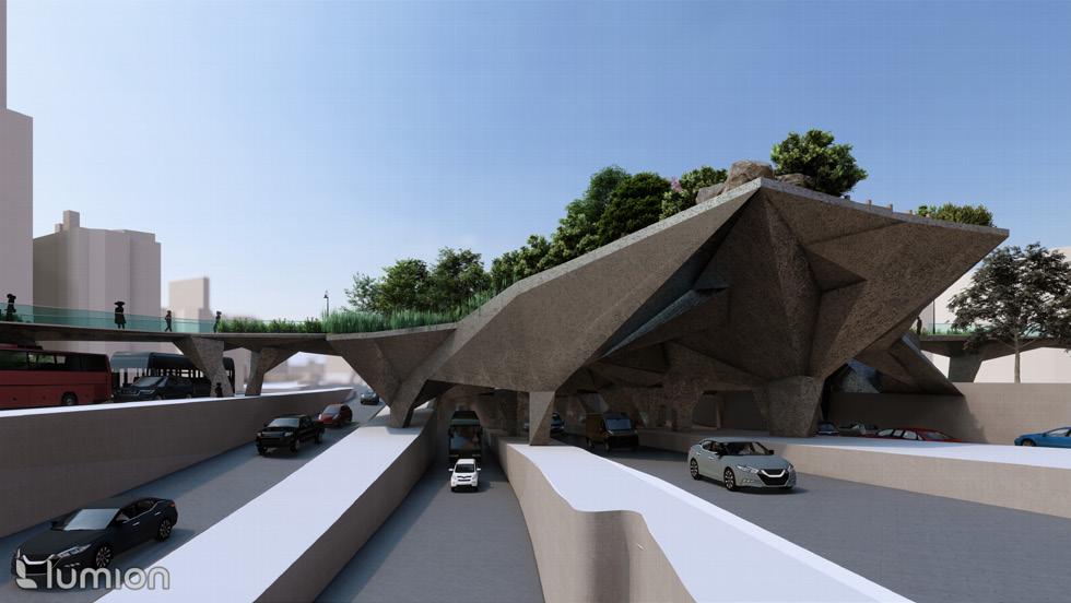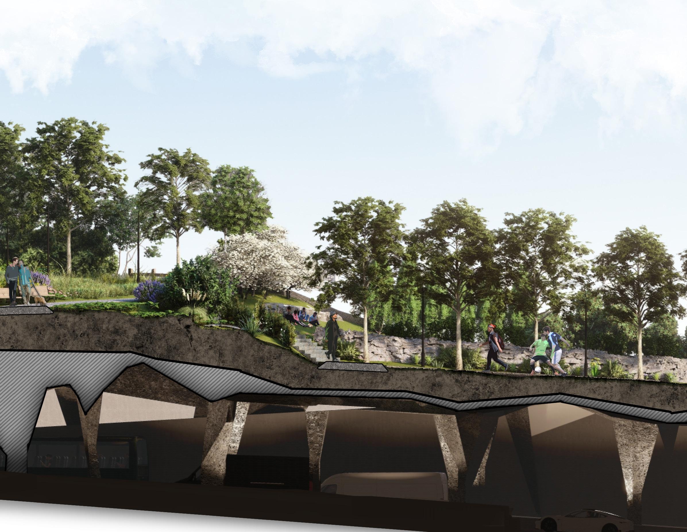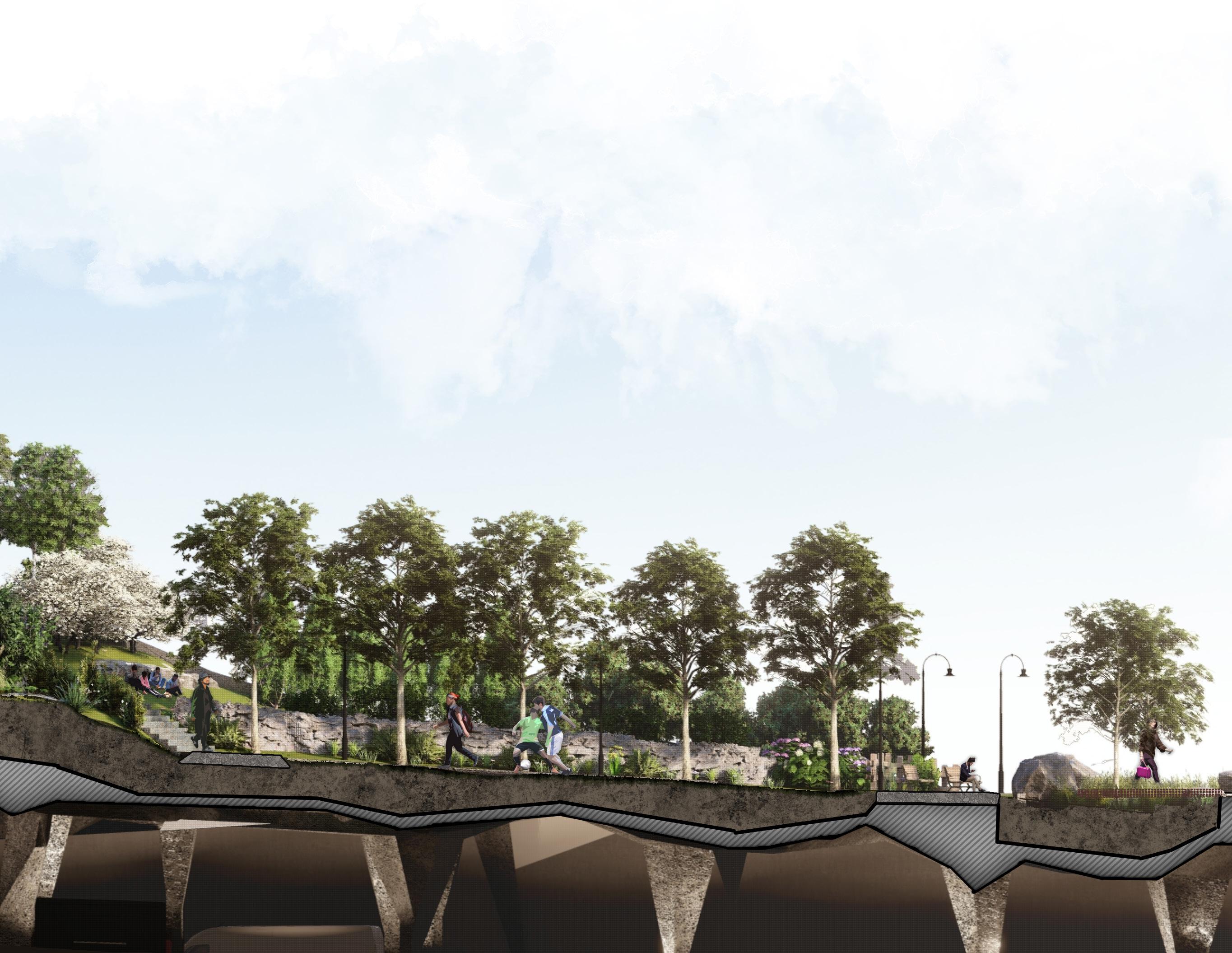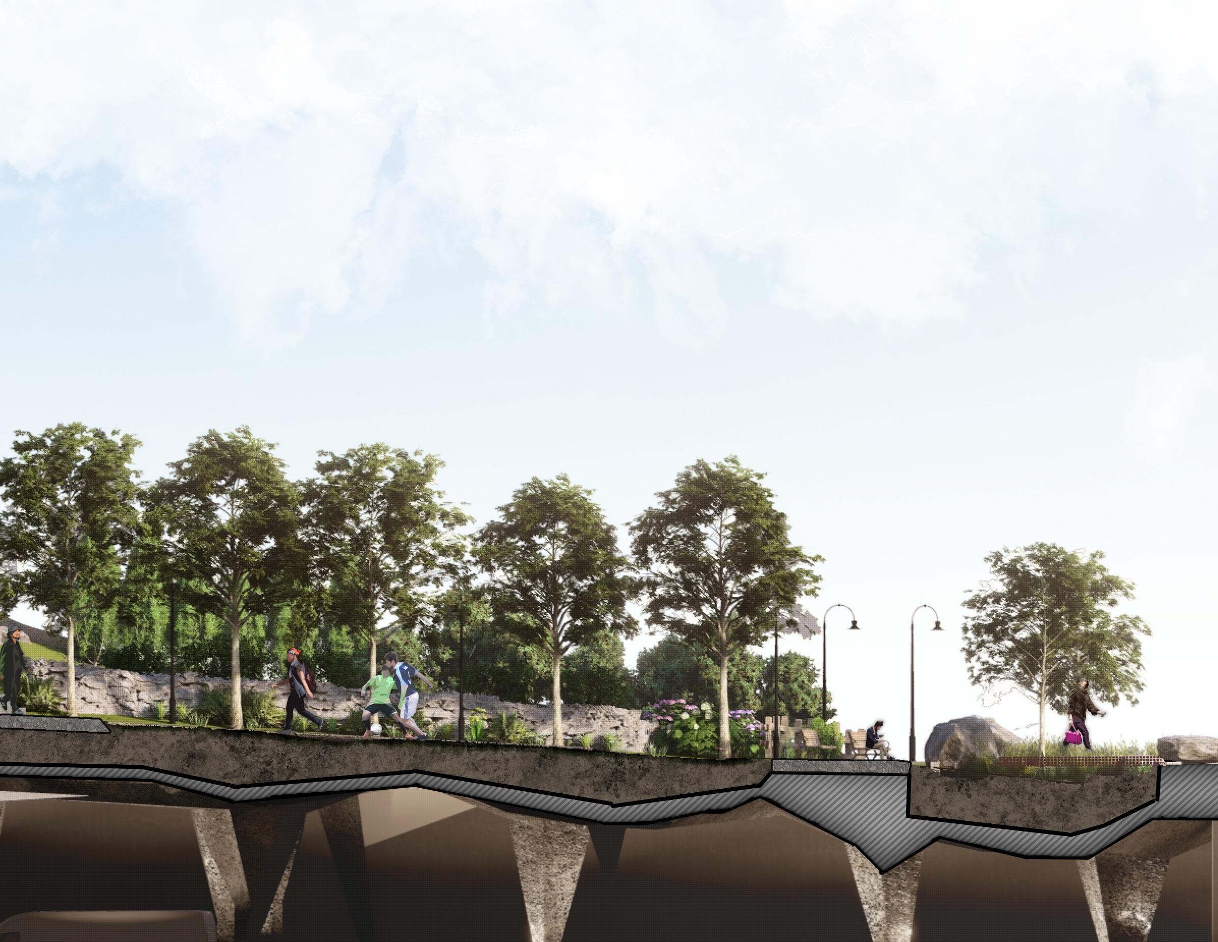 The design also pays tribute to the ecosystems that surrounded the peninsula, filled in by land reclamation efforts. While entire neighborhoods of land were created over top of salt marshes and tidal flats, here plant life is added over top of an urban freeway.