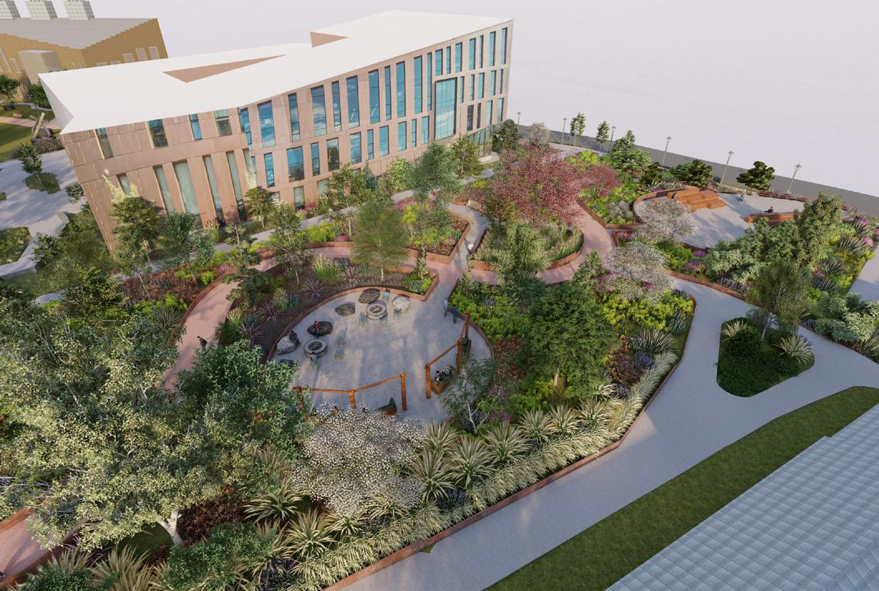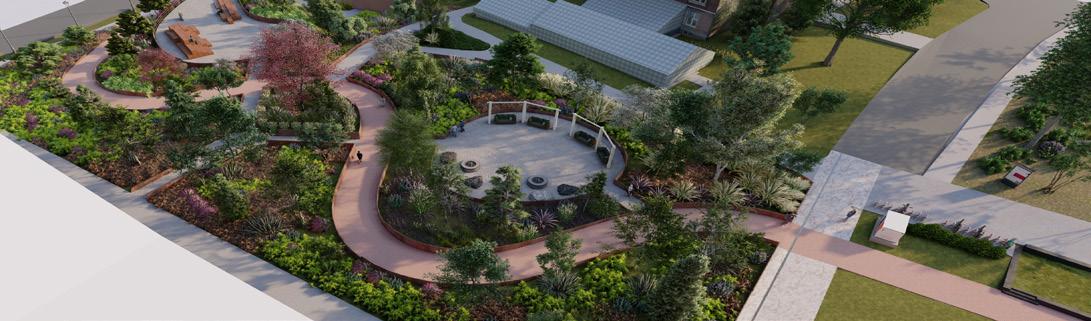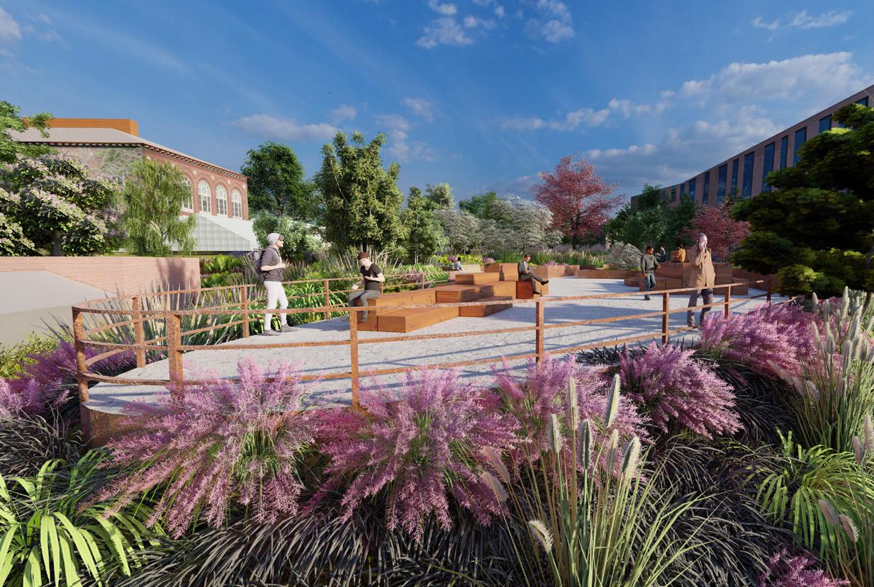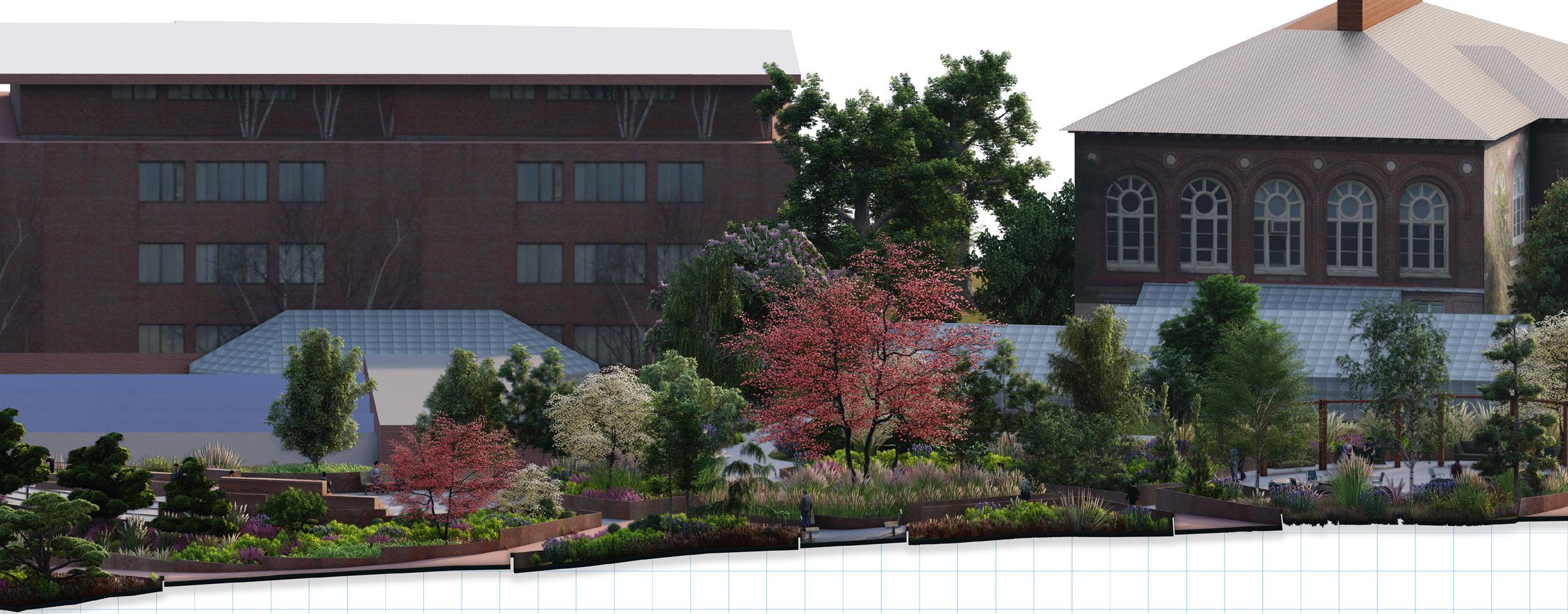 The The terraced gardens and geometric structure was designed to be reminiscent of the Hanging Gardens of Babylon. The visual ap- petence of layered plantings gives a sense of verticality to the area.