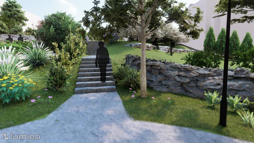 Terraced gardens give verticality to the site