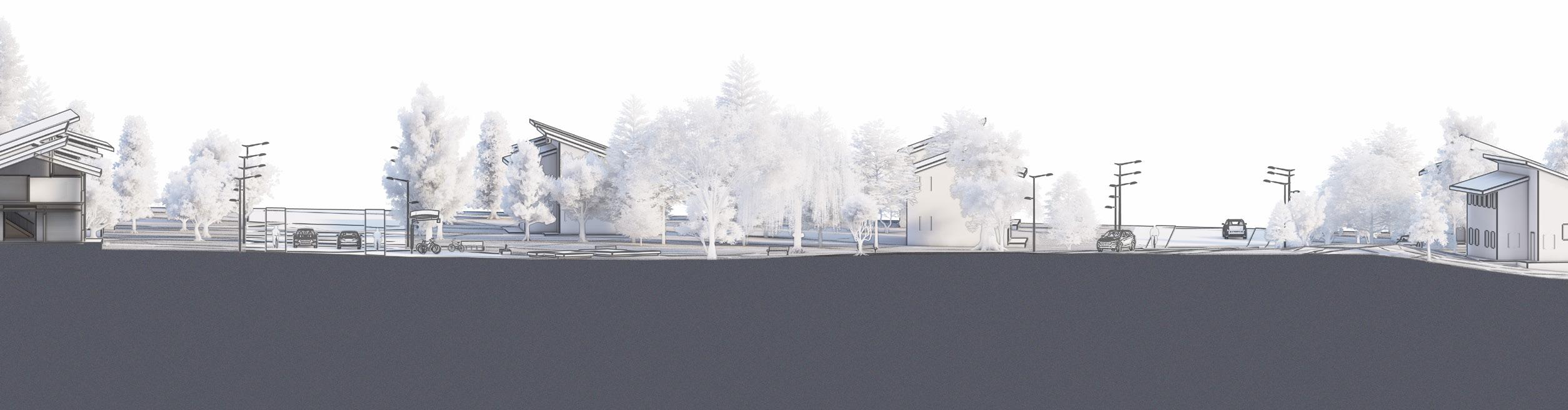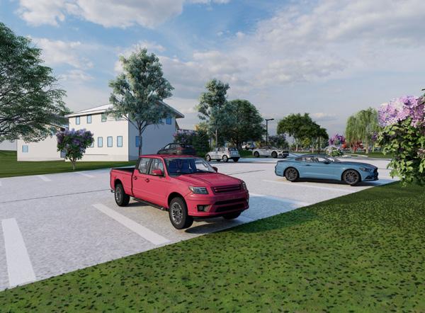 Parking is centralized and visually minimal
