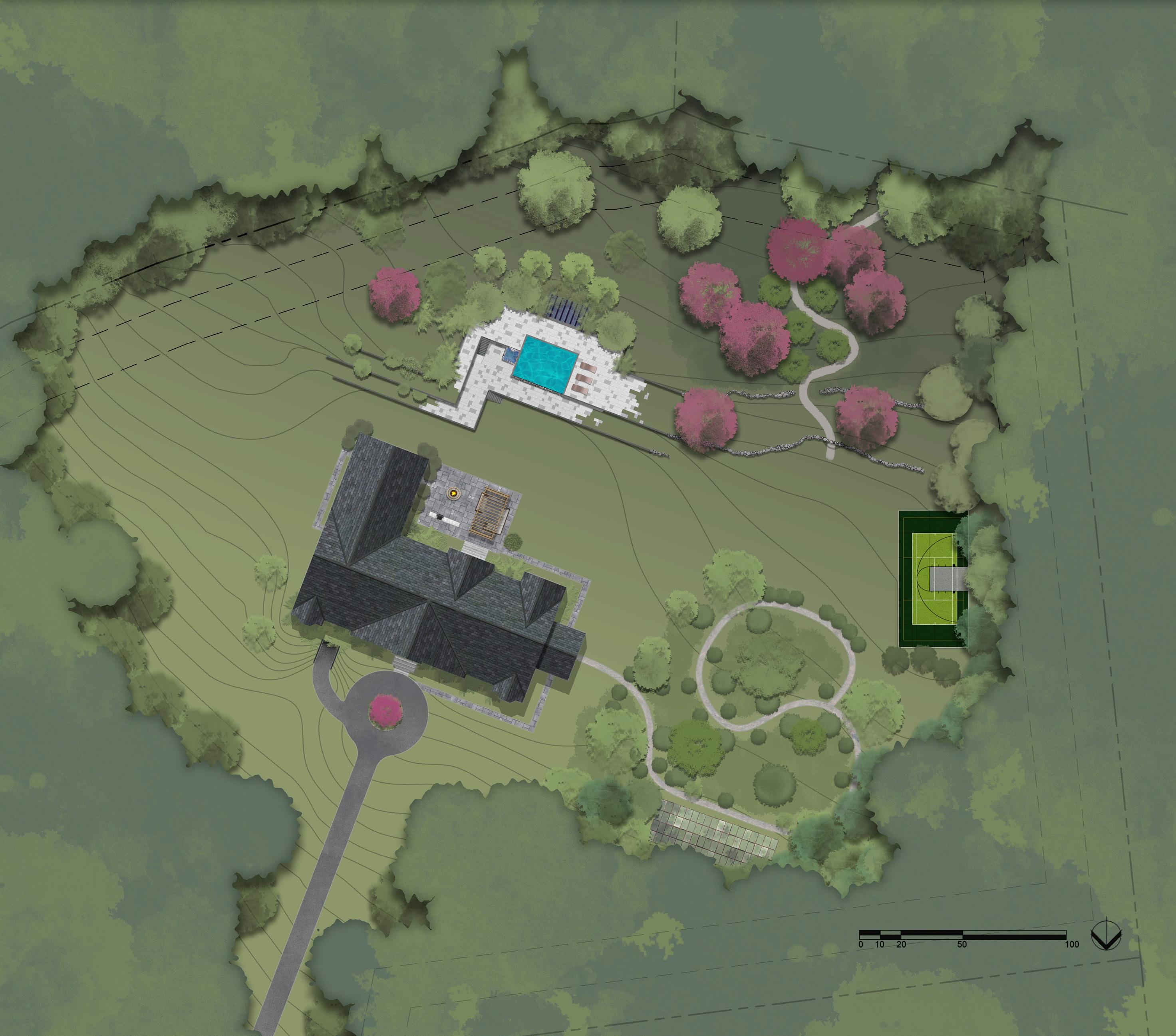 A design to unite an entire site through various qualities. Each section of the property is designed with it’s own character, signified through geometry, color, material, and plantings.
