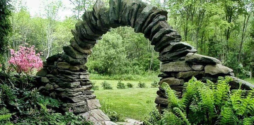The shade garden’s entrance is a circular stone gate that meets the fieldstone walls. The stone circle was chosen to subtly evoke the Celtic mythology of faerie circles, as a quasi-mystical sculptural element.