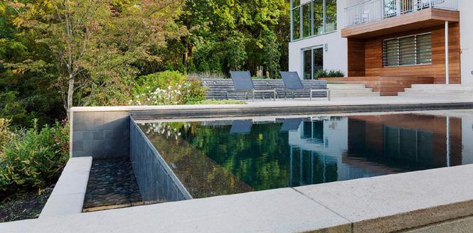 In contrast to the bluestone walls that form the pool terraces, the shade garden is defined by more naturalistic fieldstone walls. These also serve to tie the garden in with the pre-existing stone walls adjacent to the property.