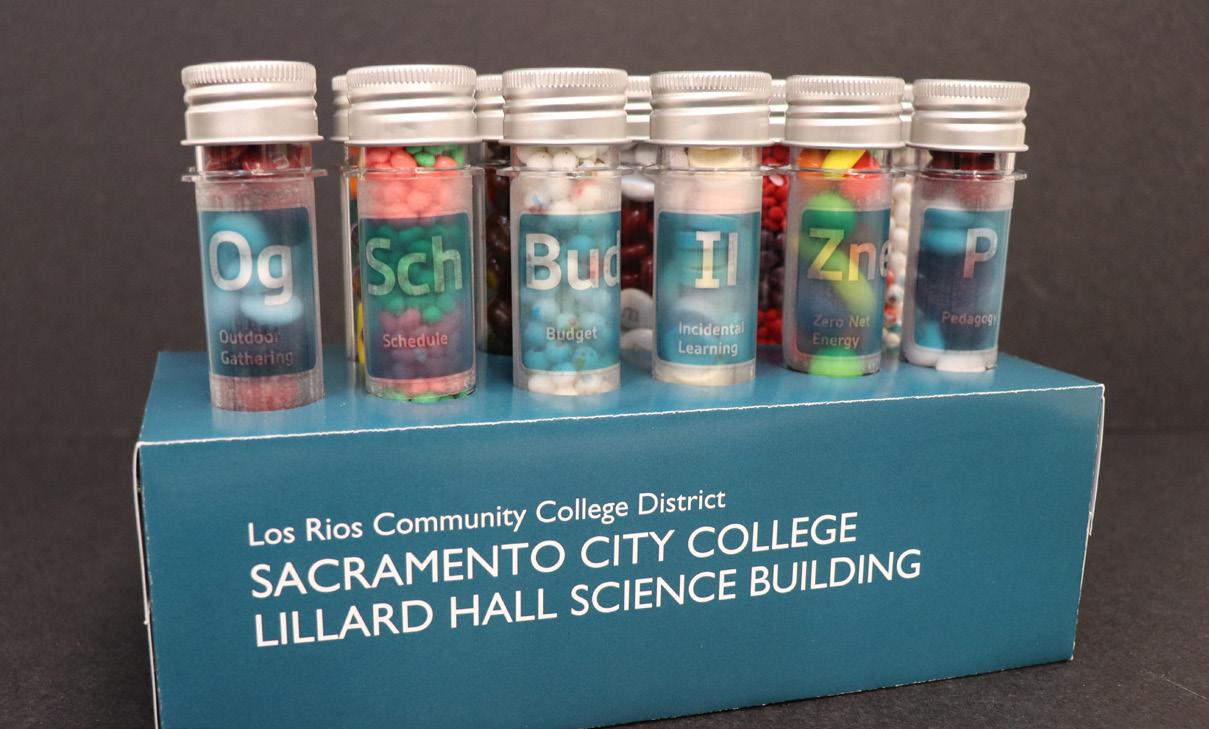 + A test tube rack design identifies the chemical makeup of a city college project’s core elements.