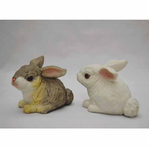 2PC BOEHM PORCELAIN RABBITS RESTING, WHITE AND WILD, SCULPTURES, 1978