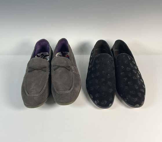 This duo of men’s designer shirts includes a stylish Bugatchi shirt featuring a grey striped pattern with circle accents and detailed cuffs. It is marked as shaped fit and measures 31.5”L in length and 24.5”W across the chest. The second is a sleek Theory shirt designed with vertical stripes in rich plum tones, accented with brown, white, and black. It is marked size L and measures 30”L in length and 22”W across the chest. Perfect additions to any wardrobe.