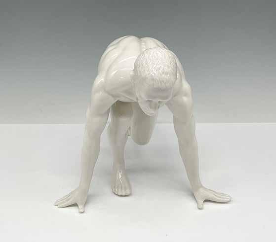 Bronze sculpture of a man standing with his right arm raised, hand clenched in a fist, on green marble base. Weight: 19 pounds.