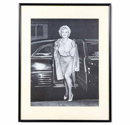 Framed black and white print of Marilyn Monroe stepping out of a car wearing white pumps, pencil skirt, blouse, and long jacket. Black plastic frame with cream white matboard border. Sight size: 13.25inH x 10.5inW; frame: 18inL x 14inW x 0.75inD.