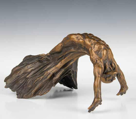 Beautifully detailed sculpture of man seemingly in flight. The look of bronze gives it a metal feel. Can be mounted on wall. Artist signed and dated.