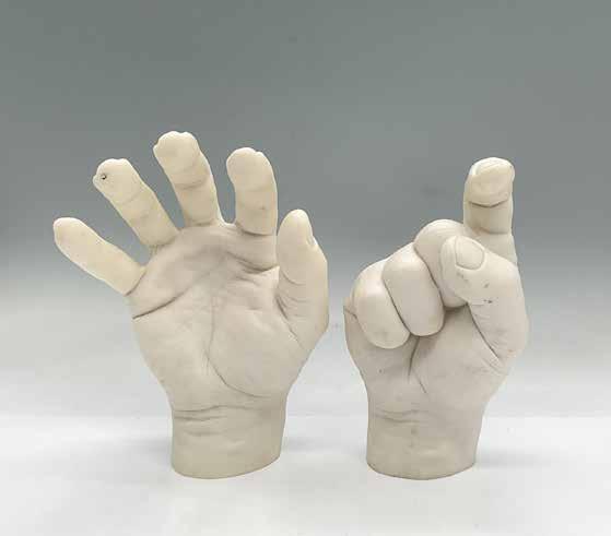 Earthenware in gold finish of partial torso and mouth of a man. Attached on metal pole to plexiglass base. Marlo M.A.C. Sculpture Inc. affixed label to base.