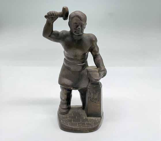 Bronze sculpture of a shirtless man in the process of metalsmith work. Weight: 3 pounds.