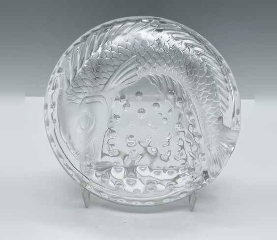 Stunning thick crystal, features a frosted relief and detailed fish figure. Lalique engraved signature.