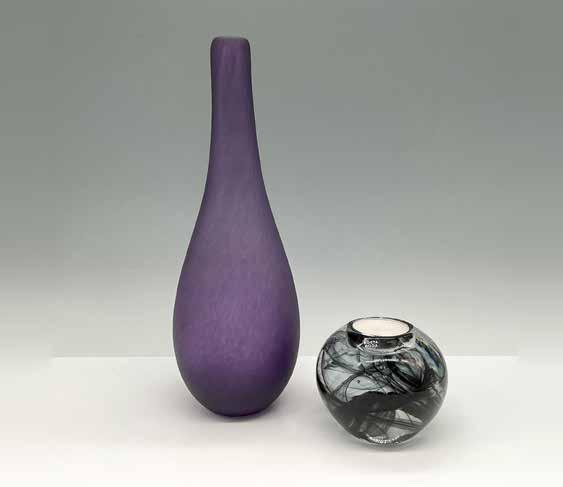 Rounded sensuous lines with clear weighted base. Orrefors backstamp. This item has its original box: 6.5”L x 12”W x 6.5”H.