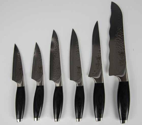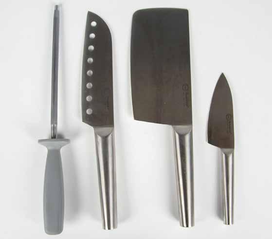 High quality stainless steel and feature stylish stainless-steel handles. 4-piece set includes: Honing Steel 13”, Santoku knife with holes 12.5”, Cleaver 12.5” and santoku knife
