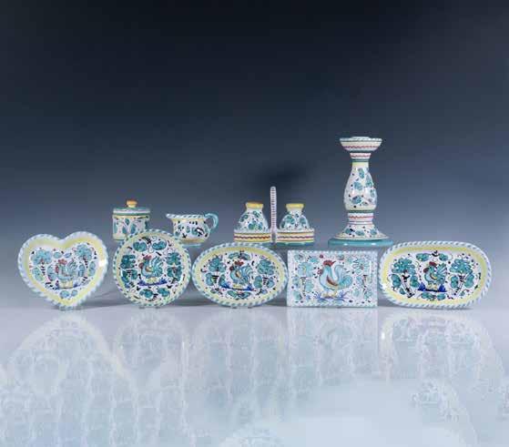 Includes a divided platter, elongated bowl, traditional platter, three octagonal bowls, two standing bowls, one accompanied by a spoon, and a lidded two-handle bowl. Jean Couzon backstamp.