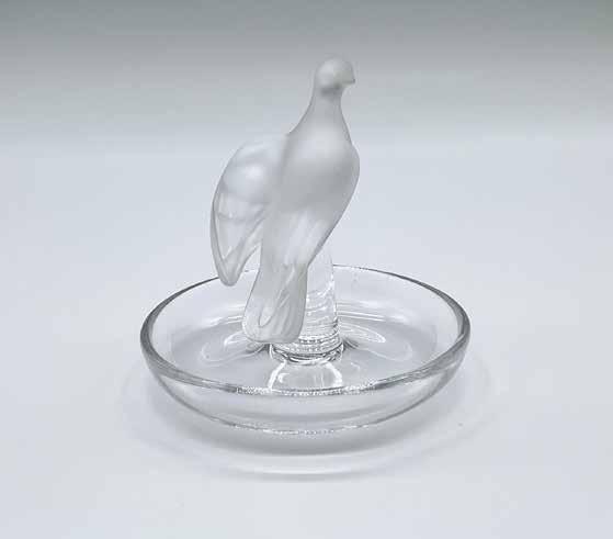 Elegant frosted glass, features detailed bird designs and botanical shapes. Designed by Rene Lalique in 1933. Lalique engraved signature.