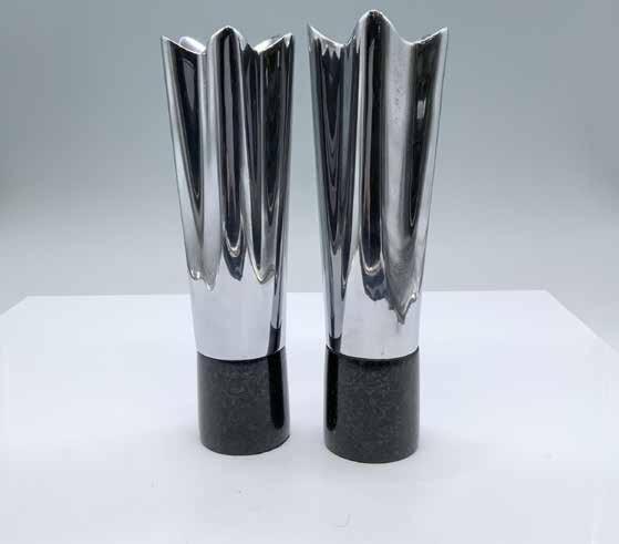 Two candle holders designed by Neil Cohen made from metal and black granite. Nambe hallmarks.