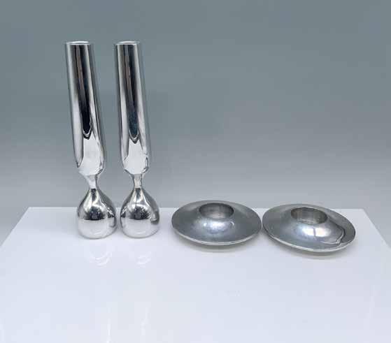 Modernistic silver metal candle holders with Nambe acid marks on the bottoms. The pair of tall candlesticks measure approximately 2”dia. x 9”H. The pair of flat candle holders measure approximately 4.5”dia. x 1”H.