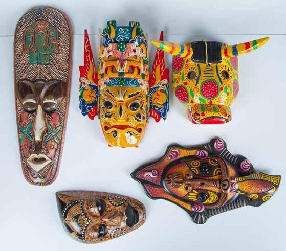 Colorful and well-designed mask from Indonesia to Jamaica, Five mask range in sizes from 9.5” to 19.75”. Largest piece is 19.75”L x 6.5”W x 1.5”H.