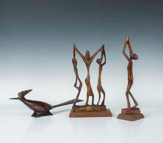 Smooth rosewood figure of a roadrunner bird 15”L x 2.5”W x 4.5”H. Figural of three people 7”L x 3”W x 12”H. Figure of a man playing a woodwind instrument 4.25”L x 3”W x 13”H.