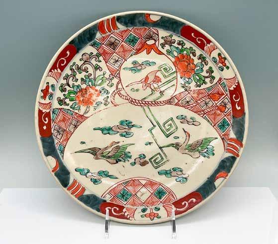 Hand painted and decorated in blue and rust coloration with gilt on rim and within design. Paneled, raised enameled scenes of bird, flowers, mountains and waterway. Logo syllabic backstamp.